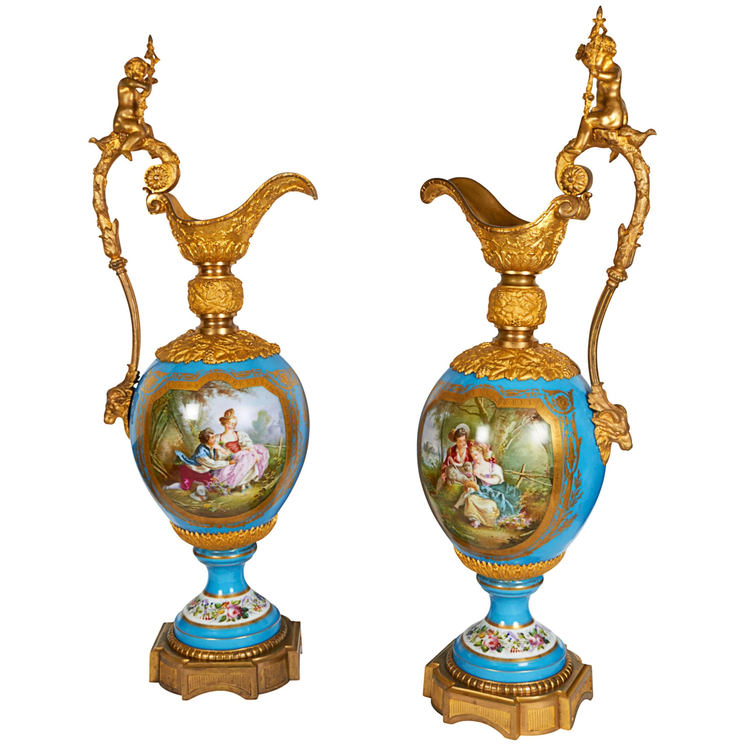 Palace Size Pair of French Sèvres Porcelain and Ormolu-Mounted Ewers